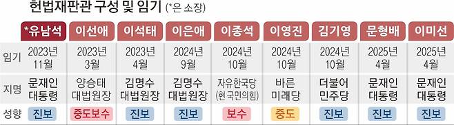 28일 법조계에 따르면 재판관 9명 중 6명은 진보 성향으로 평가된다. 유남석 소장, 이석태·이은애·김기영·문형배·이미선 재판관은 문재인 전 대통령, 김명수 대법원장 및 더불어민주당이 지명한 진보 성향으로 분류된다.