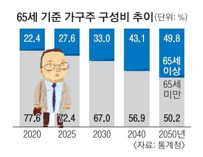 2050년엔 전체 가구의 절반이 고령자 가구가 되며, 이 중 노인 홀로 거주하는 가구가 10가구 중 4가구꼴로 늘어날 전망이다.