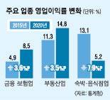 코로나19 팬데믹 첫해인 2020년 금융·보험업과 부동산업은 큰 폭의 영업이익률(매출액 대비 영업이익) 개선에 힘입어 호황을 누렸다. 위기에 대응하기 위해 대규모 유동성이 풀리면서 자산시장이 호조를 보인 영향으로 풀이된다. 반면 숙박·음식점업은 영업이익률이 절반 넘게 쪼그라들어 어려움을 겪은 것으로 확인됐다.