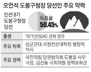 도봉구는 서울 25개 자치구 가운데에서도 고령화가 상대적으로 빠르게 진행되는 데다 인구 유출도 눈에 띄게 늘어 도시의 활력을 위한 에너지가 필요한 상황이다. 이에 오 당선인은 우선 ‘낡은 도시’라는 인상을 바꾸는 데 주력할 계획이다. 오 당선인은 “도봉구는 경기도에서 서울로 진입하는 관문 도시라지만 바꿔 말하면 서울 외곽에 있어 발전에서 소외됐다는 뜻”이라며 “임기 동안 교통 체계를 개선하고 노후 주택 등 주민들의 주거 환경을 개선해 서울의 대표 베드타운이라는 이미지를 벗겠다”고 말했다.