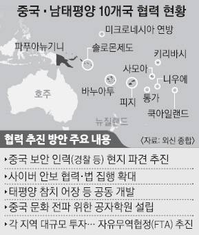 미국이 호주·뉴질랜드 등과 손잡고 섬나라들을 지원하기 위한 협력기구를 만들자 중국도 이에 질세라 한 달 만에 남태평양 도서국 외교장관 회담을 다시 제안했다.