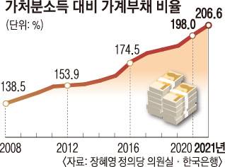 가계부채가 빠르게 증가하면서 가계의 부채 상환 능력을 보여 주는 가처분소득 대비 가계부채 비율이 지난해 200%를 넘어선 것으로 집계됐다. 가계 빚의 규모가 실제 쓸 수 있는 소득보다 두 배 이상 크다는 의미다. 시중금리가 계속 오르면 향후 가계의 대출원리금 상환 부담이 커져 우리 경제의 부실을 야기할 수 있다는 지적이 나온다.