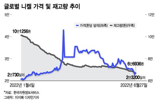 29일 한국자원정보서비스에 따르면 국내 배터리 업체들이 주로 생산하는 삼원계(NCM·니켈, 코발트, 망간) 배터리 양극재 주 소재로 쓰이는 니켈 가격이 올해 2분기 들어 현재까지 30.5% 내린 톤당 2만3200달러를 기록했다. 지난 1분기에만 59.6% 상승한 것 대비 약세로 돌아선 것이다. 지난 3월7일에는 톤당 4만2995달러를 기록하는 등 단기 고점을 기록했었다. 단 니켈 가격은 연초 대비로는 여전히 10.9% 높다.