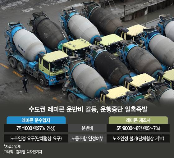 수도권 레미콘 운반차량(콘크리트 믹스트럭)이 다음 달 1일 운행중단에 돌입할 예정이다. 레미콘 제조사에 운반비 인상과 노동조합 지위를 인정하고 단체협상(단협)에 나설 것을 요구하고 있지만 입장 차를 좁히지 못하고 있다. 운반비 인상폭도 운수업자와 제조사 간 차이가 커 쉽게 합의되긴 어려운 상황이라 수도권 레미콘 공장들이 '셧다운(일시적 운영중단)' 위기에 처했다.