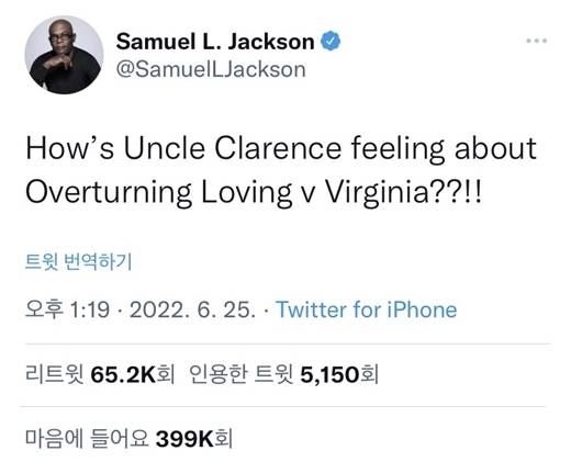 사무엘 잭슨은 25일 트위터를 통해 전날 대법원이 임신 후 약 24주까지 낙태를 인정한 일명 ‘로 대 웨이드’ 판결을 파기한 것을 두고 클래런스 토마스를 향해 일침을 가했다