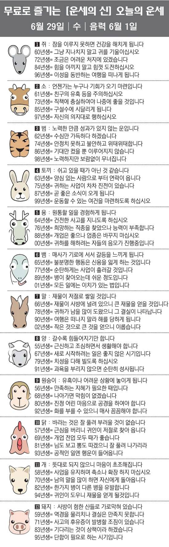 스포츠조선에서 제공하는 6월 29일(음력 6월 1일) 오늘의 운세입니다.