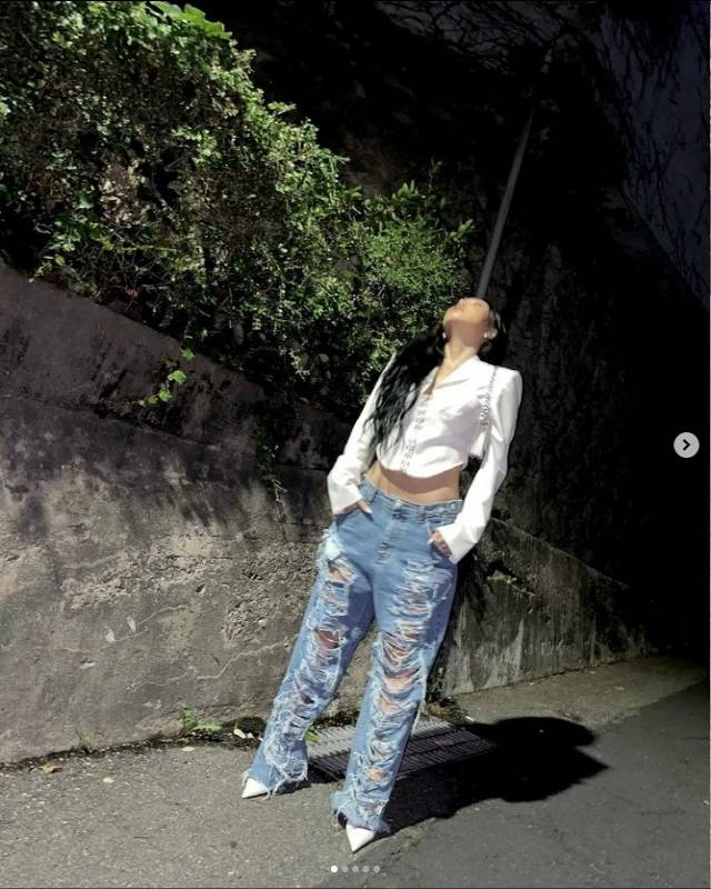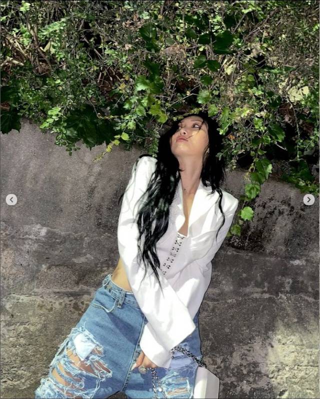 공개된 사진 속 화사는 흰 블라우스에 청바지를 입고 포즈를 취하고 있는 모습. 이때 화사의 청바지는 엄청나게 찢어져 허벅지 안쪽까지 훤하게 보여 눈길을 끌었다.
