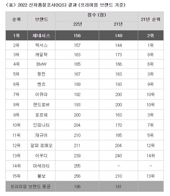제네시스는 종합 결과 156점을 기록, 2위 렉서스(157점)와 3위 캐딜락(163점)을 제치고 프리미엄 브랜드 1위를 차지했다. 전체 브랜드 기준으로는 4위다.