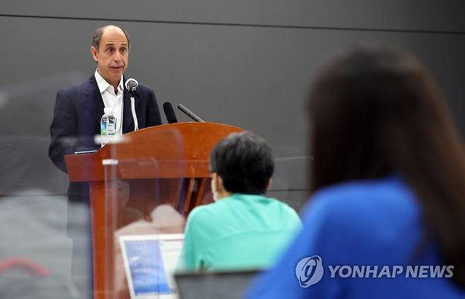 (서울=연합뉴스) 김인철 기자 = 토마스 오헤아 킨타나 유엔 북한인권특별보고관이 29일 오전 서울 종로구 글로벌센터에서 열린 기자회견에서 취재진 질문에 답하고 있다. 2022.6.29