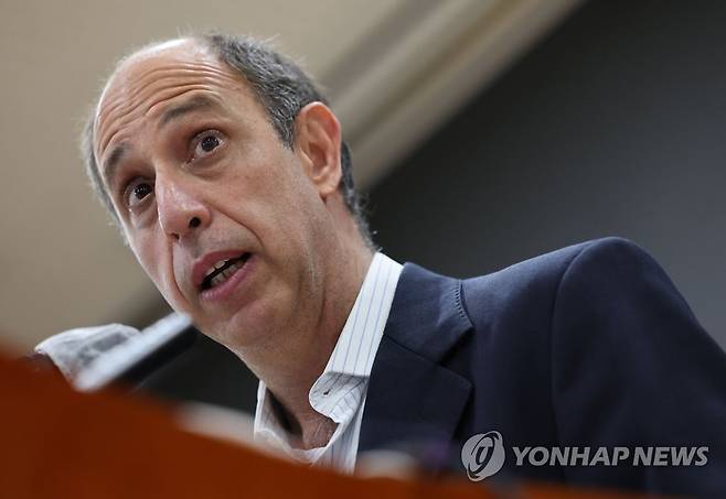 (서울=연합뉴스) 김인철 기자 = 토마스 오헤아 킨타나 유엔 북한인권특별보고관이 29일 오전 서울 종로구 글로벌센터에서 열린 기자회견에서 취재진 질문에 답하고 있다. 2022.6.29