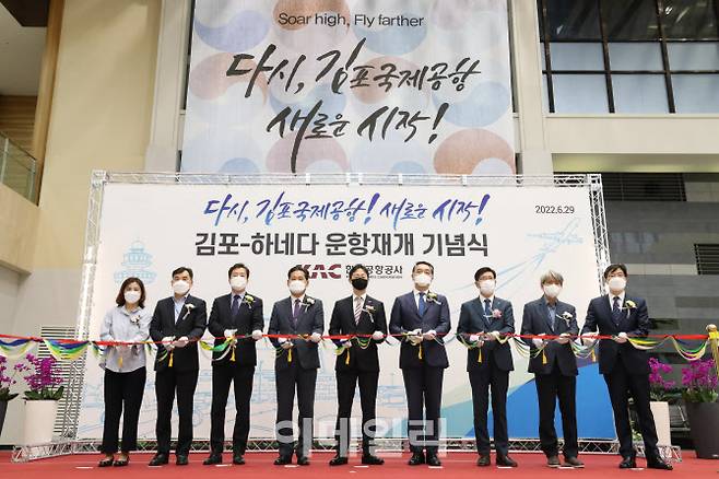 [이데일리 이영훈 기자] 윤형중 한국공항공사 사장(왼쪽 다섯 번째)이 29일 오전 서울 강서구 김포국제공항 국제선 청사에서 열린 '김포하네다 운항 재개 기념식'에서 나미오카 다이스케 주한일본대사관 경제공사(왼쪽 여섯 번째), 이수근 대한항공 부사장(왼쪽 세 번째), 정성권 아시아나항공 대표이사(왼쪽 일곱 번째) 등 주요 내빈들과 테이프 커팅 전 기념 촬영하고 있다.
