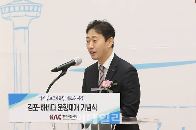 [이데일리 이영훈 기자] 윤형중 한국공항공사 사장이 29일 오전 서울 강서구 김포국제공항 국제선 청사에서 열린 '김포하네다 운항 재개 기념식'에서 기념사를 하고 있다.