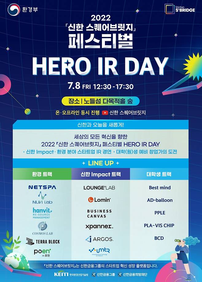 한편 스타트업 생태계 확대와 시민들과의 공감대 형성을 위해 마련된 '2022 신한 스퀘어브릿지 페스티벌'에는 7월 8일 스타트업 IR경연 대회인 HERO IR-Day가, 7월 8일 늦은 오후와 7월 9일에는 김경일, 김상욱, BE'O, 이승윤, LUCY, N.Flying, 박세리, 오은, 정세랑 등 초특급 게스트와 함께하는 'CULTURE Day'등 다양한 행사가 진행될 예정이다.