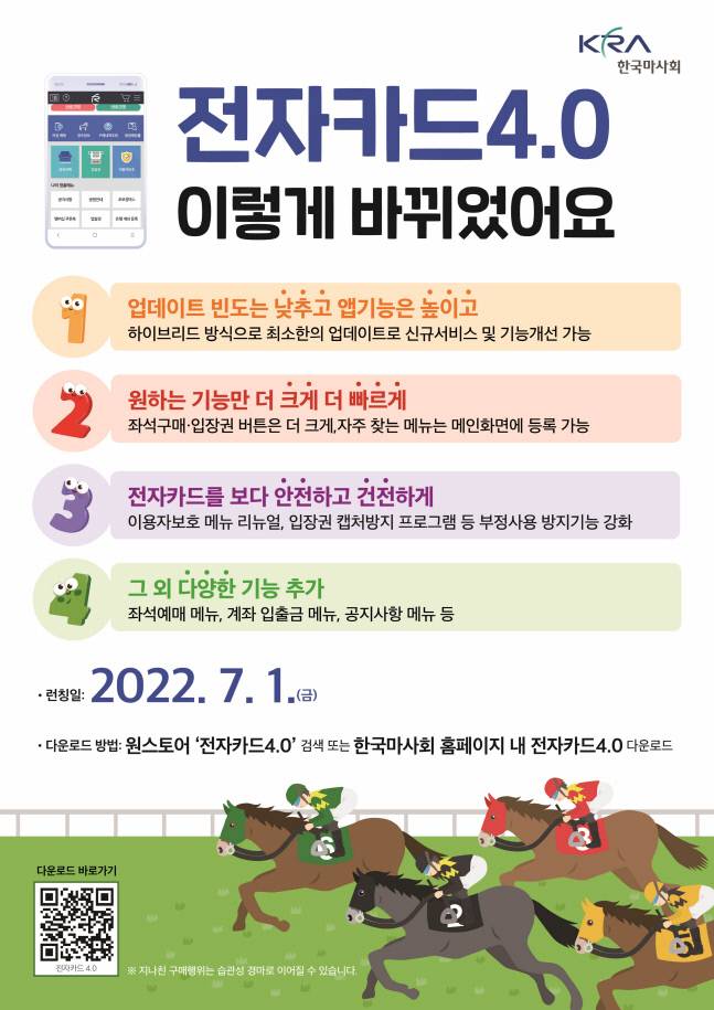 한국마사회는 오는 7월 1일 새로운 장내 모바일 마권구매 서비스 '전자카드4.0 앱'을 런칭한다.