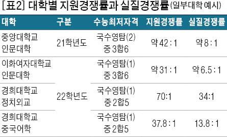 인문논술고사는 지원 경쟁률이 높은 편입니다. 11월 수능 이후 보는 인문논술 전체 대학의 평균 경쟁률은 22학년도 기준 50 대 1 정도를 기록했습니다(10월 실시 대학의 평균 경쟁률은 30 대 1, 연세대 제외). 그러나 수능 최저등급 충족률이 낮은 데다 전년도부터 통합수능이 시행된 여파로 인문계 학생들의 평균 수능 등급이 상당히 저하돼 최저 자격을 통과한 학생들의 실질 경쟁률이 턱없이 낮습니다. 이는 인문논술의 지원 자격인 수능 최저만 충족해도 논술 합격 가능성이 상당히 올라간다는 의미입니다. 따라서 우선적으로는 본인이 받아낸 6월 모의고사 결과를 기준 삼아 현실적으로 충족할 수 있는 대학을 물망에 올려놔야 합니다.