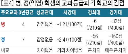 물론 학교마다 계산하는 방식이 달라 실제 교과 점수는 여러분이 아는 점수보다 올라가는 경우가 많습니다. 예를 들어 동국대는 3년간 가장 잘한 상위 10과목만 봅니다. 따라서 요강을 참고해 계산해 보는 것이 바람직합니다. 학교에 따라 지원하는 학생들의 교과 수준에 차이가 있으므로 절대적인 감점이 커도 상대적으로는 극복할 수 있는 범위 안에 있을 수 있습니다. 논술답안 채점 방식과 문제 난이도에 따라 교과의 실질적 영향력이 커지거나 작아질 수 있습니다. 일선 학교에서 교과 점수를 무시하고 수능 최저 자격만으로 지원하는 경우를 왕왕 보는데, 그렇게 하면 기대만큼 합격하기 어렵습니다. 객관적이고 정량화된 분석을 바탕으로, 각 대학의 유불리를 면밀히 따져보길 바랍니다.