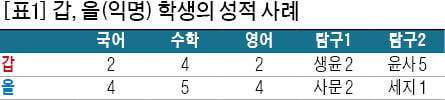 예를 들어 보겠습니다. 아래는 갑 학생과 을 학생의 수능 성적입니다.