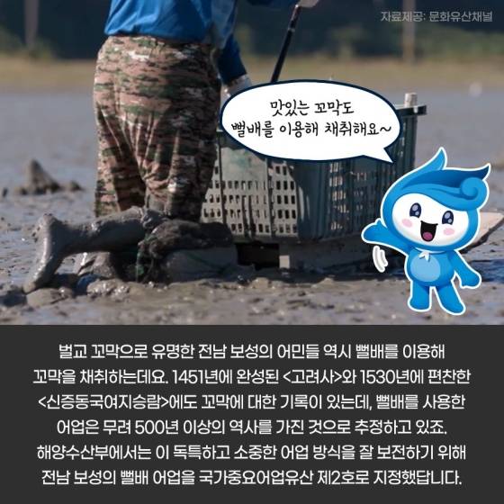 해양수산부에서는 이 독특하고 소중한 어업 방식을 잘 보전하기 위해 전남 보성의 뻘배 어업을 국가 중요 어업 유산 제2호로 지정했답니다.