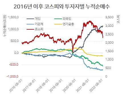 우리 증시의 수급 역학구도도 완전히 바뀌었다. 코스피 투자자별 수급을 보면 2019년까지는 외국인과 기관이 대칭적 행보를 보였다. 외국인이 팔면 기관이 사고, 기관이 팔면 외국인이 사는 모습이었다. 2020년을 기점으로 시장은 개인이 기관·외국인과 대결하는 형국으로 바뀐다.