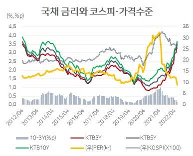 현재 코스피 PER는 10배 안팎, 주가순자산비율(PBR)은 0.9배가량이다. 역사적으로 낮은 수준이지만 저점은 아니다. 글로벌 금융위기 때 PER는 7.4배, PBR는 0.78배까지 떨어졌다. 현재 수준은 2018년 말 미국의 장·단기 금리 차 역전 가능성에 따른 불황 우려가 한창일 때와 비슷하다.