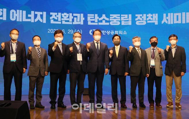 [이데일리 김태형 기자] 최태원(가운데) 대한상공회의소 회장이 29일 오전 서울 중구 대한상의 국제회의장에서 열린 제2회 에너지 전환과 탄소중립 정책 세미나에서 참석자들과 기념촬영을 하고 있다.