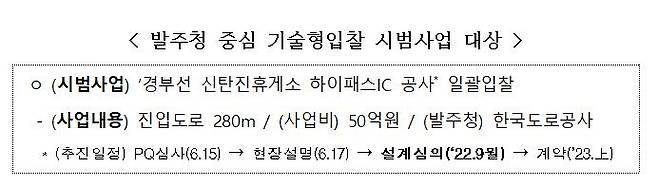 첫 시범사업 대상은 한국도로공사의 '경부선 신탄진휴게소 하이패스IC 공사'다. 평가지표 등에 대한 평가위원(소속직원) 역량강화 교육을 거쳐 9월 중 기술력 중심 평가를 진행할 예정이다. 발주청인 한국도로공사와 시범사업의 단계별 진행상황을 점검한 후 모니터링 결과를 바탕으로 제도보완 사항을 도출하고, 2차 시범사업도 추진하면서 시범사업 지침(가이드라인)도 마련할 예정이다.