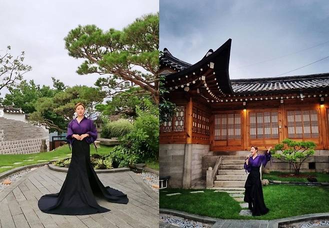 공개된 사진엔 고즈넉한 분위기의 한옥 건물 앞에서 촬영 중인 송가인의 모습이 담겼다. 사진 속 송가인은 밑단이 넓게 퍼지는 드레스로 고혹미를 뽐냈다. 특유의 단아한 매력도 돋보였다.