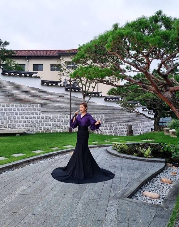 사진 속 송가인은 밑단이 넓게 퍼지는 드레스로 고혹미를 뽐냈다.