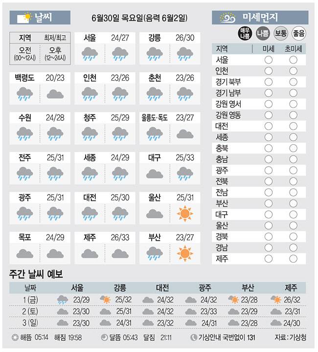 <날씨이야기>6월30일 목요일(음력 6월2일)