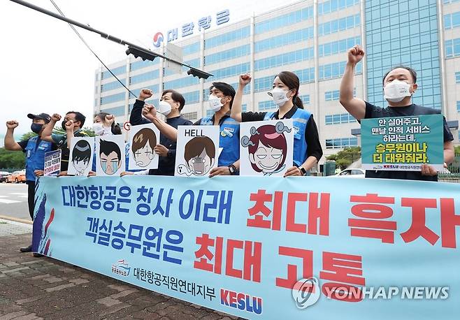 (서울=연합뉴스) 김도훈 기자 = 29일 오전 서울 강서구 대한항공 본사 앞에서 공공운수노조 대한항공직원연대지부 관계자들이 객실 승무원 근무 인원 충원 촉구 기자회견을 하고 있다.