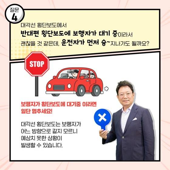 Q4. 대각선 횡단보도에서 반대편 횡단보도에 보행자가 대기 중이라서 괜찮을 것 같은데, 운전자가 먼저 슝~ 지나가도 될까요?