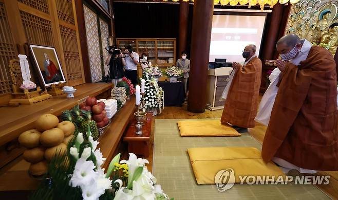 (서울=연합뉴스) 김인철 기자 = 29일 오전 서울 중구 동국대학교 정각원에서 열린 만해스님 78주기 추모 다례재에서 동국대학교 이사장인 성우 스님(오른쪽 두번째부터)과 돈관 건학위원장 스님이 합장하고 있다. 2022.6.29