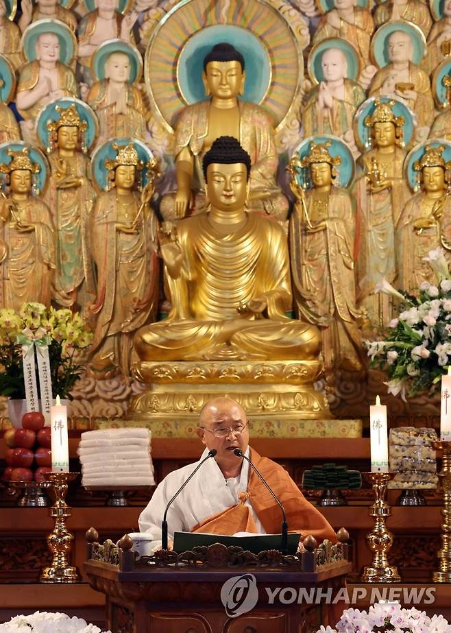 (서울=연합뉴스) 김인철 기자 = 29일 오전 서울 중구 동국대학교 정각원에서 열린 만해스님 78주기 추모 다례재에서 동국대학교 이사장인 성우 스님이 추도법어를 하고 있다. 2022.6.29