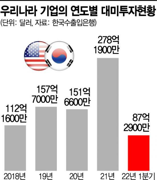 한편 한국수출입은행 통계를 보면, 우리 기업의 미국 내 직접투자는 올해 1분기 88억2900만달러로 앞서 1년 전 같은 기간에 비해 두 배 이상 늘었다. 코로나19 여파가 가시지 않았던 지난해에도 278억달러를 투자하며 일년 전보다 두 배 가까이 늘려왔다. 미국은 우리 기업의 전체 해외투자 가운데 3분의 1로 단일 국가로는 가장 많은 수준이다.