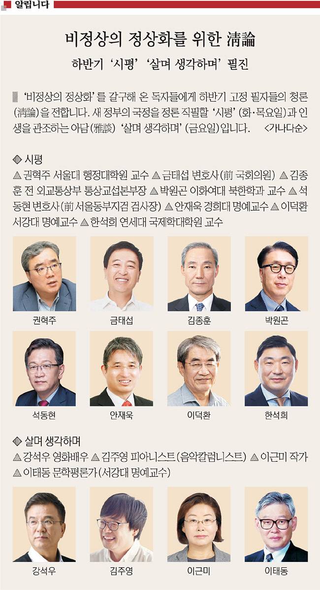 <알립니다>비정상의 정상화를 위한 淸論.. 하반기 '시평' '살며 생각하며' 필진