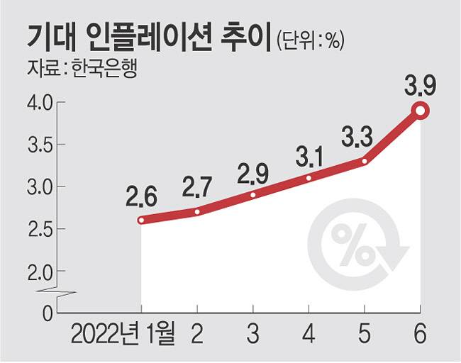 한은이 29일 발표한 ‘6월 소비자동향조사’ 결과에 따르면 이달 기대인플레이션율은 3.9%로, 2012년 4월(3.9%) 이후 가장 높았다. 지난달(3.3%)과 비교해 0.6%포인트 급등하며 4%대를 넘봤다. 한 달간 상승 폭은 한은이 해당 통계를 집계한 이후 가장 높은 수치다. 2011년 1월 0.4%포인트 상승이 최대였다. 기대인플레이션은 기업 및 가계들이 예측하는 향후 1년간의 소비자물가 상승률을 나타내는 지표로, 민간 소비보다 1분기 선행 지표로 여겨진다.