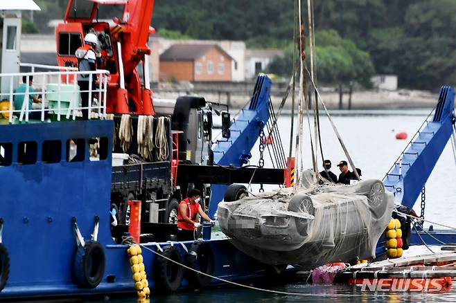 [완도=-뉴시스] 이영주 기자 = 29일 오전 전남 완도군 신지면 송곡항에서 실종된 조유나(10)양의 일가족이 탔던 차량이 그물망에 싸여진 채 인양되고 있다. 2022.06.29. leeyj2578@newsis.com