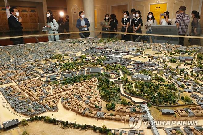 (서울=연합뉴스) 진연수 기자 = 29일 서울 종로구 서울역사박물관에서 개관 20주년을 맞아 개편 공사를 마치고 재개관을 앞둔 상설전시실을 찾은 참석자들이 전시를 관람하고 있다. 2012년 개관 10주년을 맞아 전면 개편한 이후 10년 만에 개편된 상설전시실에서는 조선의 수도가 된 1394년 이래 대한제국기와 일제강점기를 거쳐 현대에 이르기까지 서울의 역사를 만나볼 수 있다. 2022.6.29