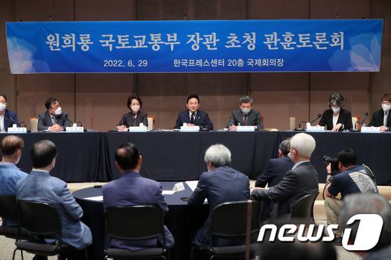 (서울=뉴스1) 박세연 기자 = 원희룡 국토교통부 장관이 29일 서울 중구 한국프레스센터에서 열린 국토교통부 장관 관훈클럽 초청토론회에서 발언을 하고 있다. 2022.6.29/뉴스1