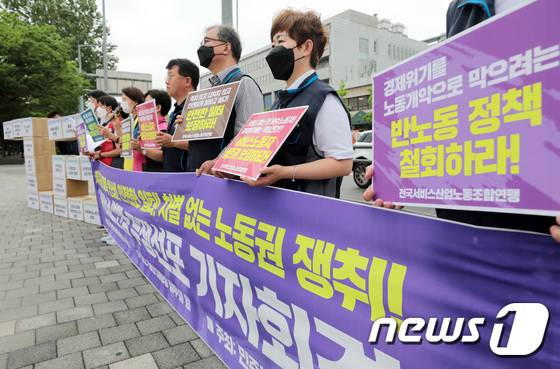 (서울=뉴스1) 조태형 기자 = 민주노총 전국서비스산업노동조합연맹 조합원들이 29일 서울 용산구 전쟁기념관 앞에서 최저임금 대폭 인상·안전한 일터 보장·차별 없는 노동권 보장을 요구하며 7월 2일에 개최되는 전국노동자대회에 참가, 투쟁 선포 기자회견을 하고 있다. 2022.6.29/뉴스1