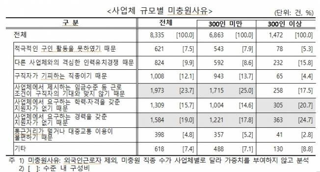 반면 300인 이상 규모 사업체에서는 '지원자가 사업체가 요구하는 경력에 못 맞춘다'는 응답이 24.7%로 가장 높고, '지원자가 사업체에서 요구하는 학력이나 자격을 못 맞춘다'는 대답이 20.7%로 나타났다.