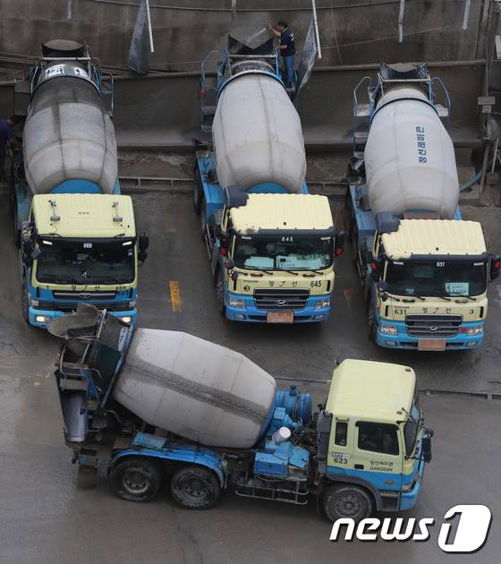 (안양=뉴스1) 박세연 기자 = 29일 경기도 안양시의 한 레미콘 공장에서 레미콘 차량들이 운행을 준비하고 있다.