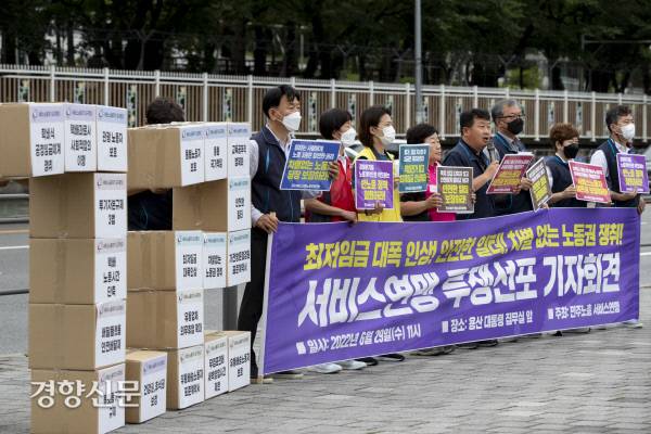 전국서비스산업노동조합연맹 조합원들이 29일 용산 대통령실 앞에서 '최저임금 대폭인상! 안전한 일터! 차별없는 노동권 쟁취!' 투쟁선포 기자회견을 하고 있다.