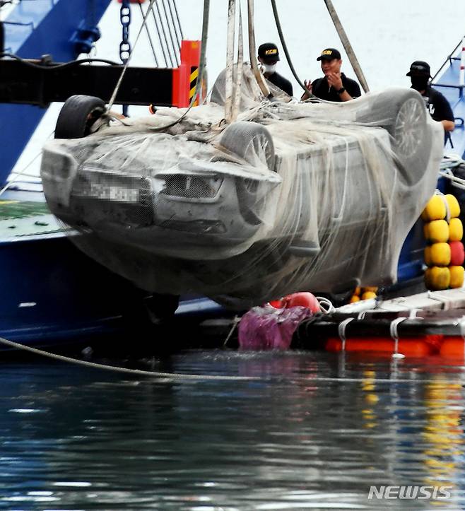 [완도=-뉴시스] 이영주 기자 = 29일 오전 전남 완도군 신지면 송곡항에서 실종된 조유나(10)양의 일가족이 탔던 차량이 그물망에 싸여진 채 인양되고 있다. 2022.06.29. leeyj2578@newsis.com