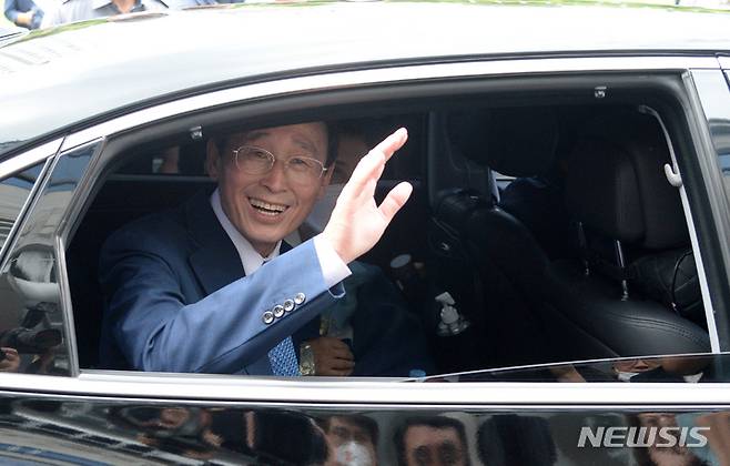 [전주=뉴시스] 김얼 기자 = 송하진 전북도지사가 29일 전북 전주시 전북도청에서 열린 퇴임식을 마치고 취재진에게 인사를 하고 있다. 2022.06.29. pmkeul@newsis.com