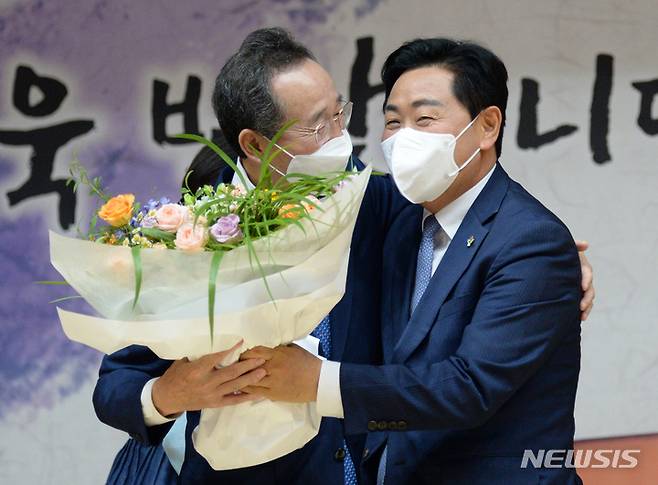[전주=뉴시스] 김얼 기자 = 송하진 전북도지사가 29일 전북 전주시 전북도청 공연장에서 열린 퇴임식에서 김관영 전북도지사 당선인에게 꽃다발을 전달받고 있다. 2022.06.29. pmkeul@newsis.com
