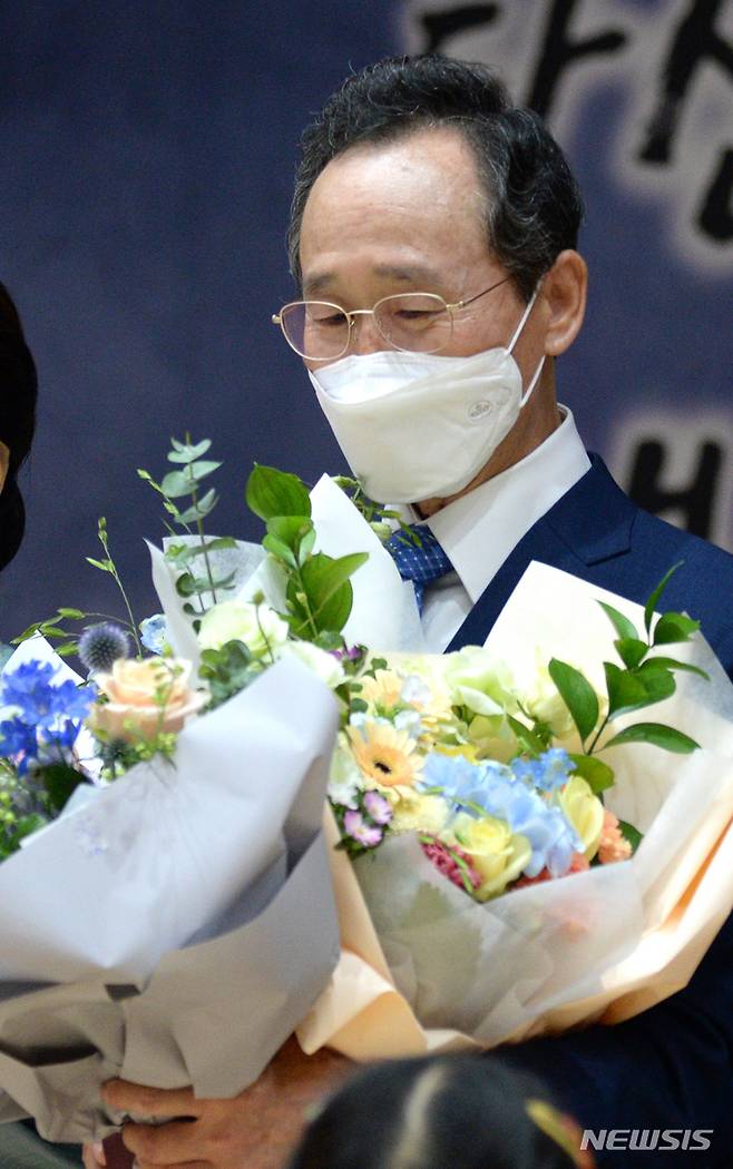 [전주=뉴시스] 김얼 기자 = 송하진 전북도지사가 29일 전북 전주시 전북도청 공연장에서 열린 퇴임식에서 받은 꽃다발을 보며 생각에 잠겨 있다. 2022.06.29. pmkeul@newsis.com