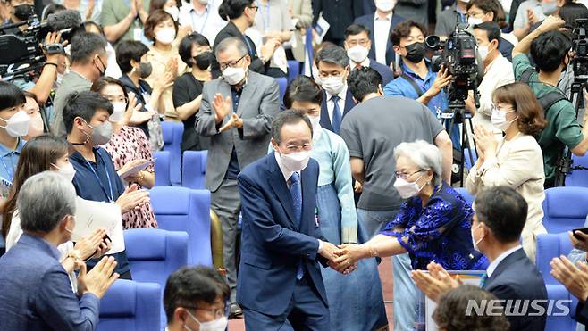 [전주=뉴시스] 김얼 기자 = 송하진 전북도지사가 29일 전북 전주시 전북도청 공연장에서 열린 퇴임식에 참석해 인사를 받으며 장내로 들어서고 있다. 2022.06.29. pmkeul@newsis.com