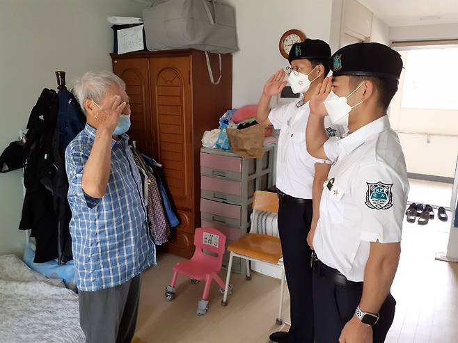 [논산=뉴시스] 유순상 기자= 충남 논산시 건양대는 군사경찰대학 교수와 학생들이 6.25 전쟁 72주년을 맞아 참전용사인 임건교(84), 최상기(89), 이순혁(92)씨 자택을 방문, 미리 준비한 감사편지와 함께 소정의 위문금을 전달했다고 29일 밝혔다. 학생들이 충남 계룡시에 거주하는 이순혁씨 집을 방문, 경례를 하고 있다. (사진=건양대 제공) 2022.06.29. photo@newsis.com