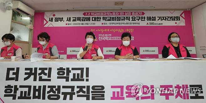 (서울=연합뉴스) 신현우 수습기자 = 민주노총 전국학교비정규직노동조합(학교비정규직노조) 조합원들이 29일 오후 서울 용산구 학교비정규직노조 대회의실에서 새 정부·새 교육감에 대한 학교 비정규직 요구안 해설 기자간담회를 하고 있다. 2022.6.29